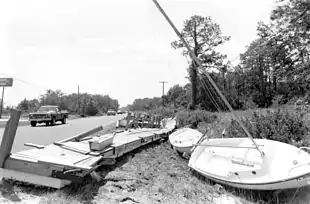 The hurricane tore two barges from their moorings in Tampa Bay and blew them into Gandy Bridge,[27] leaving the bridge with unspecified damage.[63] Throughout the area, rising waters inundated streets, washed boats ashore, and destroyed numerous homes along the coast.[64] At low-lying Cedar Key to the north, storm surge exceeded 9 ft (2.7 m).[27] There, and at Alligator Point to the northwest, the surge values represented return periods of 25 to 30 years; elsewhere, they were equivalent to about 10-year events.[65] Floodwaters in Cedar Key rose to 8 ft (2.4 m) in depth, with 2 ft (0.61 m) waves atop the standing water. The extent of structural damage was largely dependent on construction type, as newer, elevated buildings fared much better than older structures nearer sea level. Waterfront restaurants were especially susceptible; winds blew out several large sliding-glass doors at one establishment, allowing both the winds and the tide to enter its interior.[49] Elena severed the sole bridge to Cedar Key, temporarily isolating the city and stranding several residents. The Florida Department of Transportation hurriedly worked to make the bridge passable long enough to rescue the stranded individuals.[66] The hurricane compromised several other roads, destroying a 75 ft (23 m) section of State Road 24. Monetary losses in Cedar Key alone were estimated at $2 million,[67] and all major aspects of local infrastructure were severely affected, initially preventing residents from returning home to the island.[68] At least 34 homes and businesses on the island were damaged or destroyed.[69]