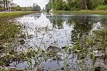 On September 16, approximately 5 million gallons of partially treated wastewater spilled into the Cape Fear River after a treatment plant lost power.[125] An estimated 2,000 yd3 (1,530 m3) of coal ash from the closed Sutton Power Station near Wilmington was also swept into the river. Torrential rains from the storm itself, estimated at 30 inches (760 mm), also caused a swamp to spill into the cooling pond.[130] On September 19, the H.F. Lee Energy Complex in Goldsboro flooded to the point where their three ponds were completely underwater and began releasing coal ash into the Neuse River.[131]