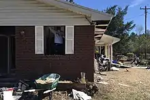 Two people in North Carolina died while trying to evacuate: one in Columbus County and Wayne County.[103][104] In Wilmington, a mother and her baby were killed when a tree landed on their house. In Hampstead, a woman died of a heart attack; downed trees on roads kept first responders from reaching her. A person was electrocuted in Lenoir County while plugging in a generator in the wet conditions.[105] A house fire in Fayetteville killed a husband and wife. Freshwater flooding killed at least eleven people: one in Anson County, eight Duplin County, and two in Scotland County.[83][104][106] One man was killed in Kinston by strong winds while checking on his hunting dogs.[107] A three-month-old baby died in Gaston County when a tree crushed a mobile home.[103] In Union County, a woman drove around a barrier into a flooded road and her vehicle was swept away. Rescuers saved the mother, but her one-year-old baby drowned.[108] An 18-wheeler aquaplaned off Interstate 85 near Kings Mountain and crashed into a tree; the vehicle tore in half, killing the driver.[109] Two other accidents each killed one person: an elderly man died of oxygen loss related to chronic obstructive pulmonary disease during a power outage, and a person collapsed and died in Sampson County while helping an evacuee.[104] One person drowned in the swelling Cape Fear River near Cedar Creek after refusing evacuation orders.[110] On September 20, a man in Brunswick County died after being crushed by a tree he was clearing.[111] In late September, two people were killed in North Carolina while repairing damage from Hurricane Florence to their homes, bringing the death toll in the state to 39.[112]