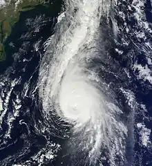 On October 14, the eye contracted to a diameter of 17 mi (27 km) and improved its satellite presentation.[6] At 18:00 UTC, Gonzalo strengthened to a Category 3 major hurricane while located about 170 mi (275 km) north of San Juan, Puerto Rico.[2] Six hours later it became the first Category 4 hurricane in the Atlantic basin since Hurricane Ophelia in 2011. Subsequently, a concentric eyewall structure indicated an imminent eyewall replacement cycle, with the inner feature "about as small as it can get" according to the NHC.[7] The eyewall replacement cycle briefly disrupted the storm's core, causing Gonzalo to weaken slightly,[8] but upon completion on the evening of October 15, the system stabilized and resumed intensification.[9][10] While moving northward early the next day, Gonzalo reached its peak intensity with winds of 145 mph (235 km/h) and a barometric pressure of 940 mbar (hPa; 27.76 inHg). By evening it had turned north-northeastward, ahead of an advancing trough over the eastern United States and in the wake of the receding ridge.[2]