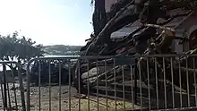 Structural damage ranged from the superficial to complete wall or roof failure, the latter being relatively uncommon.[56] A multitude of buildings, including churches, a visitor's center, the House of Assembly building in Hamilton, and the Bermuda Police Service headquarters at Prospect Camp, suffered some degree of roof damage.[70][71][72] Older structures were particularly prone to substantial damage,[2] as were commercial storage buildings subject to less strict building codes.[73] In December, five new slate quarries were approved to accommodate the demand for roofing materials.[74] Both the new and the old portions of King Edward VII Memorial Hospital received significant damage that exposed the facilities to the elements.[75] An exhibit at the Bermuda Aquarium, Museum and Zoo was unroofed, and coastal erosion threatened to encroach on the site, though no animals were harmed.[76] Part of the structure's roof was blown a one-quarter mile (400 m).[77]