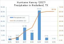 Hurricane Harvey was a devastating Category 4 hurricane that made landfall on Texas and Louisiana in August 2017, causing catastrophic flooding and more than 100 deaths. It is tied with 2005's Hurricane Katrina as the costliest tropical cyclone on record,[nb 1] inflicting $125 billion (2017 USD) in damage, primarily from catastrophic rainfall-triggered flooding in the Houston metropolitan area and Southeast Texas;[1][2] this made the storm the costliest natural disaster recorded in Texas at the time.[3] It was the first major hurricane[nb 2] to make landfall in the United States since Wilma in 2005, ending a record 12-year span in which no hurricanes made landfall at the intensity of a major hurricane throughout the country.[4] In a four-day period, many areas received more than 40 inches (1,000 mm) of rain as the system slowly meandered over eastern Texas and adjacent waters, causing unprecedented flooding. With peak accumulations of 60.58 in (1,539 mm), in Nederland, Texas, Harvey was the wettest tropical cyclone on record in the United States. The resulting floods inundated hundreds of thousands of homes, which displaced more than 30,000 people and prompted more than 17,000 rescues.
