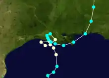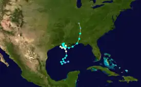 On October 31, the storm moved across the Mississippi Delta near Burrwood, Louisiana, and accelerated to the northeast,[3][2] influenced by an approaching upper-level trough.[5] At 1200 UTC that day, Juan attained a secondary peak of 70 mph (110 km/h). In the subsequent six hours, the storm weakened slightly, making its final landfall just west of Pensacola, Florida with winds of 65 mph (100 km/h) late on October 31.[3][2] After striking Florida, Juan turned to the north and weakened over land. After moving through Alabama, the storm became extratropical over Tennessee on November 1. Although the Atlantic hurricane best track ceased tracking the circulation at 1800 UTC that day,[3][2] Juan continued generally northward through the Ohio Valley, and the center eventually crossed into Canada. The energy from Juan helped spawn an occluded low in the Tennessee Valley, which produced more rainfall throughout the region.[5][6] An approaching cold front absorbed the remnants of Juan on November 3.[7]