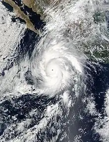 Hurricane Kenna was the fourth-most intense tropical cyclone on record in the Eastern Pacific basin, and at the time the third-most intense Pacific hurricane to strike the west coast of Mexico.[1] Kenna was the sixteenth tropical depression, thirteenth tropical storm, seventh hurricane, sixth major hurricane, and third Category 5 hurricane of the 2002 Pacific hurricane season. After forming on October 22 to the south of Mexico from a tropical wave, forecasters consistently predicted the storm to strengthen much less than it actually did. Moving into an area of favorable upper-level conditions and warm sea surface temperatures, Kenna quickly strengthened to reach peak winds of 165 mph (266 km/h) as a Category 5 hurricane, on October 25, while located about 255 mi (410 km) southwest of Puerto Vallarta, Jalisco. Weakening as it turned to the northeast, the hurricane made landfall near San Blas, Nayarit as a Category 4 hurricane, with sustained winds of 140 mph (230 km/h), before dissipating on October 26 over the Sierra Madre Occidental mountains.