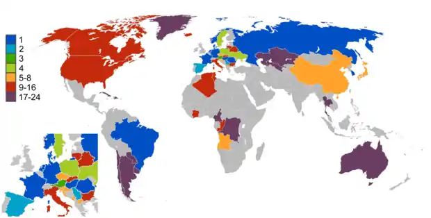 Nine teams participated in the first championship, this number has grown in steps to 32 (from 2021). In 1977 a B-tournament was introduced and later in 1986 a C-tournament which served as qualification for the real championship or A-tournament. The B- and C-tournament qualifications were replaced by the present qualification system based on continental confederations in 1993.[1]
