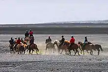 The ancestors of the Icelandic horse were probably taken to Iceland by Viking Age Scandinavians between 860 and 935 AD. The Norse settlers were followed by immigrants from Norse colonies in Ireland, the Isle of Man and the Western Isles of Scotland.[2] These later settlers arrived with the ancestors of what would elsewhere become Shetland, Highland, and Connemara ponies, which were crossed with the previously imported animals.[8] There may also have been a connection with the Yakut pony,[15] and the breed has physical similarities to the Nordlandshest of Norway.[16] Other breeds with similar characteristics include the Faroe pony of the Faeroe Islands[17] and the Norwegian Fjord horse.[18] Genetic analyses have revealed links between the Mongolian horse and the Icelandic horse.[19][20][21] Mongolian horses are believed to have been originally imported from Russia by Swedish traders; this imported Mongol stock subsequently contributed to the Fjord, Exmoor, Scottish Highland, Shetland and Connemara breeds, all of which have been found to be genetically linked to the Icelandic horse.