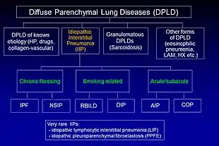 Idiopathic pulmonary fibrosis (IPF) belongs to a large group of more than 200 lung diseases known as interstitial lung diseases (ILDs), which are characterized by the involvement of the lung interstitium,[9] the tissue between the air sacs of the lung. IPF is one specific presentation of idiopathic interstitial pneumonia (IIP), which is in turn a type of ILD, also known as diffuse parenchymal lung disease (DPLD).