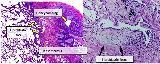 Fibroblastic foci are dense collections of myofibroblasts and scar tissue and, together with honeycombing, are the main pathological findings that allow a diagnosis of UIP.