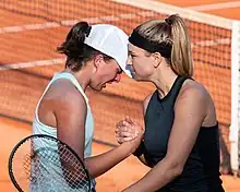 In May, Świątek entered the Italian Open as the defending champion. In the second round, she doubled-bageled Anastasia Pavlyuchenkova before defeating Lesia Tsurenko and Donna Vekić in the following rounds. In the quarterfinals, she faced Elena Rybakina and was forced to retire in the third set after sustaining a right thigh injury.[86] At the French Open, Świątek reached her fourth major final without dropping a set. She won her third French Open and fourth major title overall, defeating Karolína Muchová in three sets in the final.[87][88] She also became the first woman to defend the title since Justine Henin in 2007.[89] At the Wimbledon, Świątek reached her first ever quarterfinal at the tournament after eliminating Zhu Lin, Sara Sorribes Tormo, Petra Martić and Belinda Bencic. In the quarterfinal, she lost to Elina Svitolina in three sets,[90] which ended her 14-match win streak.[91]