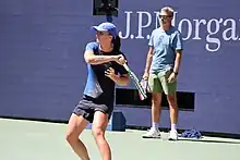 Świątek aims to come to the net, and has good volleying skills due to her doubles experience.[119] Świątek possesses an accurate first serve, peaking at 114 mph (183 km/h), and averaging at 103 mph (166 km/h), allowing her to serve aces, dictate play from the first stroke, and win a majority of first-serve points. She possesses an effective kick serve, and an effective slice serve, which are deployed as second serves, preventing opponents from scoring free points. She also regularly uses the drop shot, and won the 2019 WTA Shot of the Year with a cross-court drop shot from the baseline that landed on the sideline well inside the service box.[26][120] Świątek aims to gain the advantage in a point by hitting the ball early on the rise.[119] Further strengths include her exceptional speed, movement, and court coverage, detailed and intricate footwork, and intelligent point construction. Her favourite surface is clay, having grown up playing on that surface, although she has had success on all surfaces.[121] Her clay court success is enhanced by her ability to slide on the surface; as her career has progressed, she has also developed the ability to slide on hard and grass courts, too.