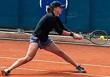 Świątek made her first WTA breakthrough at the Ladies Open Lugano in April. With her first direct acceptance into a main draw, she made her first WTA final. During the event, she upset No. 3 seed Viktória Kužmová in the second round for her first top 50 victory.[24] She ultimately finished runner-up to Polona Hercog in three sets.[25] Moreover, a precise cross-court forehand drop shot she hit against Kristýna Plíšková in the semifinal was voted the 2019 WTA Shot of the Year.[26] With the runner-up, she also made her debut in the top 100 while still 17 years old.[27] Świątek closed out her clay court season with a fourth round appearance at the French Open in her second major.[21] She upset No. 16 Wang Qiang in the second round for her first top 20 victory before losing to defending champion Simona Halep.[28][29]
