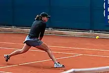 Świątek has an aggressive, all-court style of play and incorporates a lot of variety into her game. Because her game style is focused on offence, she typically generates high amounts of both winners and unforced errors.[30][113][114] She has described her style of play on clay as "a big serve, topspin, and backhand down the line".[6] Despite her aggressive style of play, she plays with margin, and constructs points carefully until she creates an opportunity to hit a winner, and in all seven of her matches played at the 2020 French Open, she hit more winners than unforced errors. In total at the French Open that year, she hit 175 winners to 127 unforced errors. The basis of Świątek's game was described by tennis journalist Christopher Clarey for The New York Times as: her sliding ability, allowing her to defend from the corners à la Kim Clijsters and Novak Djokovic, a "sprinter's speed" when moving forward to the net, power and topspin akin to her idol Rafael Nadal, and mental strength forged through sports psychology.[115]