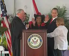Ros-Lehtinen was an educator and the owner/operator of a private school in Miami-Dade County.[10] She was elected to the Florida House of Representatives in 1982, where she met State Representative Dexter Lehtinen (D-Miami). They married on June 9, 1984, after Dexter switched parties. They both served in the State House until 1986. That year, they were both elected to the Florida Senate, where he was elected to District 40 and she was elected in District 34.[11][12] In 1988, Dexter Lehtinen resigned his seat to become U.S. Attorney of South Florida. In 1989, Ros-Lehtinen resigned her seat to become a U.S. Representative.