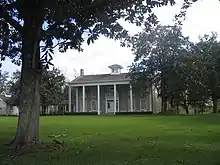 Although Hogg spent little time at the Varner plantation after Bayou Bend was constructed, she continued to purchase art and antique furniture on its behalf.[87] In the 1950s, she restored the plantation, and each room was given a different theme from Texas history: colonial times, the Confederacy, Napoleonic times (1818), and the Mexican–American War. One room was dedicated to her father, and contained his desk and chair as well as his collection of walking sticks.[88] She donated the property to the state, and it was dedicated as the Varner–Hogg Plantation State Historical Site in 1958, the 107th anniversary of Jim Hogg's birth.[89]