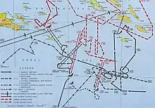 At 17:00 on 3 May, Fletcher was notified that the Japanese Tulagi invasion force had been sighted the day before approaching the southern Solomons.[28] Unable to communicate with the Lexington task force because of the need to maintain radio silence, Yorktown's task force proceeded independently toward Guadalcanal in order to be in position to launch airstrikes against the Japanese forces at Tulagi the next morning.[29][30]