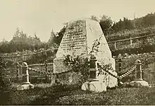 A small cairn at the foot of the Niagara Escarpment marks the spot where Brock fell. In 1824, Brock's and Macdonell's remains were moved into Brock's Monument, which overlooked the Queenston Heights. That original monument was bombed and heavily damaged in 1840. (This action was reputedly by Irish-Canadian terrorist Benjamin Lett[60] although a subsequent Assize failed to confirm this.).[61] It was replaced by a larger structure 185 feet (56 m) high, built at public expense, that still stands. Brock's remains were reinterred inside the new Monument on 13 October 1853. An inscription reads: "Upper Canada has dedicated this monument to the memory of the late Major-General Isaac Brock, K.B. provisional lieutenant-governor and commander of the forces in the province whose remains are deposited in the vault beneath. Opposing the invading enemy he fell in action near these heights on 13 October 1812, in the forty-third year of his age. Revered and lamented by the people whom he governed and deplored by the sovereign to whose services his life had been devoted."[62]