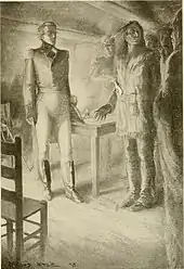 Tecumseh evidently trusted and respected Brock, reportedly saying, "This is a man" after meeting him for the first time.[3][40] Although Brock's correspondence indicates a certain amount of paternal condescension for the First Nations,[Note 3] he seems to have regarded Tecumseh very highly,[41] calling him "the Wellington of the Indians",[40] and saying "a more sagacious or a more gallant warrior does not I believe exist".[42] Brock made a number of commitments to the Shawnee. He promised to negotiate no peace treaty without addressing the Shawnee's vision of an independent homeland. There is no evidence Brock negotiated in bad faith.[Note 4][43] Brock's personal integrity and respect for First Nations peoples has been well documented, and suggest that if he had lived he would have kept his word to the Shawnee.