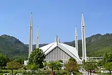 Greek architect Constantinos Apostolou Doxiadis developed Islamabad's master plan, in which he divided it into eight zones; administrative, diplomatic enclave, residential areas, educational and industrial sectors, commercial areas, as well as rural and green areas administered by the Islamabad Metropolitan Corporation with support from the Capital Development Authority. Islamabad is known its parks and forests, including the Margalla Hills National Park and the Shakarparian.[13] It is home to several landmarks, including the country's flagship Faisal Mosque, which is the world's fifth-largest mosque. Other prominent landmarks include the Pakistan Monument and Democracy Square.[14][15][16]