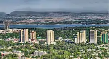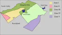 Islamabad covers an area of 906 square kilometres (350 sq mi).[47] A further 2,717 square kilometres (1,049 sq mi) area is known as the Specified Area, with the Margala Hills in the north and northeast. The southern portion of the city is an undulating plain. It is drained by the Kurang River, on which the Rawal Dam is located.[37]