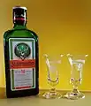 Jägermeister (/ˈjeɪɡərmaɪstər/ YAY-gər-my-stər, German: [ˈjɛːɡɐˌmaɪstɐ] ⓘ) is a German digestif[1] made with 56 herbs and spices. Developed in 1934 by Wilhelm and Curt Mast,[2][3] it has an alcohol by volume of 35% (61 degrees proof, or US 70 proof). The recipe has not changed since its creation[4] and continues to be served in its signature green glass bottle.[5] It is the flagship product of Mast-Jägermeister SE headquartered in Wolfenbüttel, Germany.