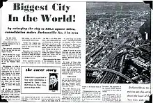 When a consolidation referendum was held in 1967, voters approved the plan with a 65 percent approval. On October 1, 1968, the city and county governments merged to create the Consolidated City of Jacksonville. Fire, police, health & welfare, recreation, public works, and housing & urban development were all combined under the new government. In honor of the occasion, then-Mayor Hans Tanzler posed with actress Lee Meredith behind a sign marking the new border of the "Bold New City of the South" at Florida 13 and Julington Creek.[52] The consolidation created a 900-square-mile entity.