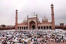 The Jama Masjid serves as Delhi's primary mosque,[8] and has a largely congregational function. The Muslims of the city traditionally gather here to offer communal Friday prayer, as well as for major festivals such as Eid. The mosque is also a major tourist attraction, and derives a significant amount of income through the visits of foreigners.[28]