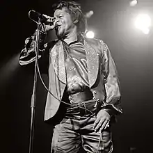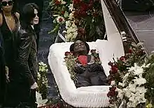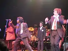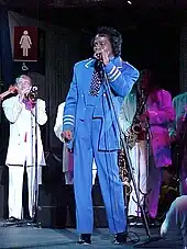 A trademark feature of Brown's stage shows, usually during the song "Please, Please, Please", involved Brown dropping to his knees while clutching the microphone stand in his hands, prompting the show's longtime MC, Danny Ray, to come out, drape a cape over Brown's shoulders and escort him off the stage after he had worked himself to exhaustion during his performance. As Brown was escorted off the stage by the MC, Brown's vocal group, the Famous Flames (Bobby Byrd, Lloyd Stallworth, and Bobby Bennett), continued singing the background vocals "Please, please don't go-oh".[74] Brown would then shake off the cape and stagger back to the microphone to perform an encore. Brown's routine was inspired by a similar one used by the professional wrestler Gorgeous George, as well as Little Richard.[72][75][76] In his 2005 autobiography I Feel Good: A Memoir in a Life of Soul, Brown, who was a fan of Gorgeous George, credited the wrestler as the inspiration for both his cape routine and concert attire, stating, "Seeing him on TV helped create the James Brown you see on stage".[77] Brown performs a version of the cape routine in the film of the T.A.M.I. Show (1964) in which he and the Famous Flames upstaged the Rolling Stones, and over the closing credits of the film Blues Brothers 2000. The Police refer to "James Brown on the T.A.M.I. Show" in their 1980 song "When the World Is Running Down, You Make the Best of What's Still Around".