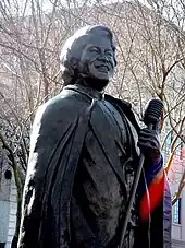 Brown stated he was neither Democratic nor Republican despite his support of Republican presidents such as Nixon and Reagan as well as Democratic presidents John F. Kennedy, Lyndon B. Johnson, and Jimmy Carter.[94] In 1999, when being interviewed by Rolling Stone, the magazine asked him to name a hero in the 20th century; Brown mentioned John F. Kennedy and then-96-year-old U.S. Senator, and former Dixiecrat, Strom Thurmond, stating "when the young whippersnappers get out of line, whether Democratic or Republican, an old man can walk up and say 'Wait a minute, son, it goes this way.' And that's great for our country. He's like a grandfather to me."[95] In 2003, Brown was the featured attraction of a Washington D.C. fundraiser for the National Republican Senatorial Committee.[96] Following the deaths of Ronald Reagan and his friend Ray Charles, Brown said to CNN, "I'm kind of in an uproar. I love the country and I got – you know I've been around a long time, through many presidents and everything. So after losing Mr. Reagan, who I knew very well, then Mr. Ray Charles, who I worked with and lived with like, all our life, we had a show together in Oakland many, many years ago and it's like you found the placard."[97] Despite his contrarian political views, Brown mentored black activist Rev. Al Sharpton during the 1970s.[98]