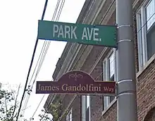 In December 2013, following an online petition campaign started by one of Gandolfini's high school classmates, the borough of Park Ridge, New Jersey gave a section of Park Avenue, the street he grew up on, the nickname "James Gandolfini Way" and signs were installed at the intersection of Park Avenue and Kinderkamack Road at a public ceremony attended by several of his former Sopranos co-stars.[118][119] In December 2013, HBO released a tribute documentary in honor of Gandolfini.[120] The documentary, titled James Gandolfini: Tribute To A Friend, featured co-star interviews and behind-the-scenes footage.[121] Spike Jonze's 2013 Academy Award winning film Her is dedicated to Gandolfini.[122] Jonze and Gandolfini had previously worked together on Where the Wild Things Are.[123] In 2014, Gandolfini was posthumously inducted into the New Jersey Hall of Fame.[124] In 2019, his son Michael was cast as the younger version of James' character Tony Soprano in The Sopranos prequel film The Many Saints of Newark.[125] Michael watched the show for the first time to prepare for the role, describing it as an intense process.[126]