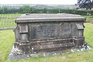 James III was buried beside his queen in front of the high altar of Cambuskenneth Abbey. His son and successor, James IV, attended the ceremony and in atonement for his involvement in his father's death, from 1496 appointed a chaplain to sing for the salvation of their souls; records of this continued until the Scottish Reformation.[61] The remains of James and Margaret were re-interred under a new stone monument at Queen Victoria's expense in 1865.[62]