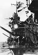 The two gun turrets on the middle flight deck were removed and 14 twin 25 mm (1 in) Type 96 gun mounts were added on sponsons.[33] They fired .25-kilogram (0.55 lb) projectiles at a muzzle velocity of 900 m/s (3,000 ft/s); at 50°, this provided a maximum range of 7,500 m (8,200 yd), and an effective ceiling of 5,500 m (18,000 ft). The maximum effective rate of fire was only between 110 and 120 rounds per minute due to the frequent need to change the 15-round magazines.[34] Six Type 95 directors were fitted to control the new 25 mm guns and two new Type 94 anti-aircraft directors replaced the outdated Type 91s. After the modernization, Akagi carried one Type 89 director for the 20 cm (7.9 in) guns; it is uncertain how many were carried before then.[9] The ship's crew increased to 2,000 after the reconstruction.[35]