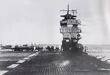 Akagi's modernization involved far less work than that of Kaga, but took three times as long due to financial difficulties related to the Great Depression.[28] The ship's three flight decks were judged too small to handle the larger and heavier aircraft then coming into service.[29] As a result, the middle and lower flight decks were eliminated in favor of two enclosed hangar decks that extended almost the full length of the ship. The upper and middle hangar areas' total space increased to about 93,000 square feet (8,600 m2); the lower hangar remained the same size.[9] The upper flight deck was extended to the bow, increasing its length to 249.17 meters (817 ft 6 in) and raising aircraft capacity to 86 (61 operational and 25 in storage). A third elevator midships, 11.8 by 13 meters (38 ft 9 in × 42 ft 8 in) in size, was added. Her arrester gear was replaced by a Japanese-designed, hydraulic Type 1 system with 9 wires.[9][30] The modernization added an island superstructure on the port side of the ship, which was an unusual arrangement; the only other carrier to share this feature was a contemporary, the Hiryū. The port side was chosen as an experiment to see if that side was better for flight operations by moving the island away from the ship's exhaust outlets.[29] The new flight deck inclined slightly fore and aft from a point about three-eighths of the way aft.[31]