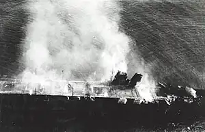 After a brief refit, Hiryū and three other fleet carriers of the First Air Fleet (Kido Butai) participated in the Battle of Midway in June 1942. After bombarding American forces on the atoll, the carriers were attacked by aircraft from Midway and the carriers USS Enterprise, Hornet, and Yorktown. Dive bombers from Yorktown and Enterprise crippled Hiryū and set her afire. She was scuttled the following day after it became clear that she could not be salvaged. The loss of Hiryū and three other IJN carriers at Midway was a crucial strategic defeat for Japan and contributed significantly to the Allies' ultimate victory in the Pacific.