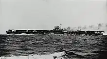 Hiryū was fitted with four geared steam turbine sets with a total of 153,000 shaft horsepower (114,000 kW), each driving one propeller shaft, using steam provided by eight Kampon water-tube boilers.[5] The turbines and boilers were the same as those used in the Mogami-class cruisers. The ship's power and slim, cruiser-type hull with a length-to-beam ratio of 10:1 gave her a speed of 34.3 knots (63.5 km/h; 39.5 mph)[6] and made her the fastest carrier in the world at the time of her commissioning.[7] Hiryū carried 4,500 metric tons (4,400 long tons) of fuel oil which gave her a range of 10,330 nautical miles (19,130 km; 11,890 mi) at 18 knots (33 km/h; 21 mph). The boiler uptakes were trunked to the ship's starboard side amidships and exhausted just below flight deck level through two funnels curved downward.[8]