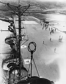 The ship's primary armament consisted of a dozen 12.7-centimetre (5 in) Type 89 dual-purpose guns in twin mounts on sponsons along the sides of the hull. Hiyō was also initially equipped with eight triple mounts for 2.5 cm Type 96 light AA guns alongside the flight deck.[9] This was the standard Japanese light AA gun during World War II but it suffered from severe design shortcomings that rendered it a largely ineffective weapon. According to historian Mark Stille, the twin and triple mounts "lacked sufficient speed in train or elevation; the gun sights were unable to handle fast targets; the gun exhibited excessive vibration; the magazine was too small, and, finally, the gun produced excessive muzzle blast".[10] In early 1943, four more triple mounts were added and another four triple mounts were added late in the year. Two of these last four mounts were mounted on the stern and the others were placed in front of and behind the island. A dozen single mounts were also added, some of which were portable and could be mounted on tie-down points on the flight deck.[9]