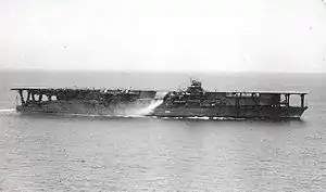 Kaga, like Akagi, was completed with three superimposed flight decks, the only carriers ever to be designed so. The British carriers converted from "large light cruisers", Glorious, Courageous, and Furious, each had two flight decks, but there is no evidence that the Japanese copied the British model. It is more likely that it was a case of convergent evolution to improve launch and recovery cycle flexibility by allowing simultaneous launch and recovery of aircraft.[7] Kaga's main flight deck was 171.2 meters (561 ft 8 in) long and 30.5 meters (100 ft) wide,[8] her middle flight deck was only about 15 meters (49 ft 3 in) long and started in front of the bridge, and her lower flight deck was approximately 55 meters (180 ft 5 in) long. The utility of her middle flight deck was questionable as it was so short that only some of the lightly loaded aircraft could use it, even in an era when the aircraft were much lighter and smaller than they were during World War II.[9] The ever-increasing growth in aircraft performance, size and weight during the 1930s meant that even the bottom flight deck was no longer able to accommodate the take-off roll required for the new generations of aircraft being fielded and it was plated over when the ship was modernized in the mid-1930s.[10] Kaga lacked an island until one was added during the modernization.[11]