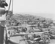 As completed, the ship had two main hangar decks and a third auxiliary hangar with a total capacity of 60 aircraft. The hangars opened onto the middle and lower flight decks to allow aircraft to take off directly from the hangars while landing operations were in progress on the main flight deck above. No catapults were fitted.[12] Her forward aircraft elevator was offset to starboard and 10.67 by 15.85 meters (35 by 52 ft) in size. Her aft elevator was on the centerline and 12.8 by 9.15 meters (42 by 30 ft). Her arresting gear was a French transverse system as used on their aircraft carrier Béarn and known as the Model Fju (Fju shiki) in the Japanese service.[13] As originally completed, Kaga carried an air group of 28 Mitsubishi B1M3 torpedo bombers, 16 Nakajima A1N fighters and 16 Mitsubishi 2MR reconnaissance aircraft.[5][Note 1]
