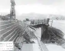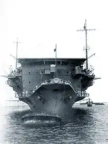 Following the Japanese ship-naming conventions for aircraft carriers, Ryūjō was named "Prancing Dragon".[13] The ship was laid down at the Mitsubishi's Yokohama shipyard on 26 November 1929. She was launched on 2 April 1931, towed to Yokosuka Naval Arsenal on 25 April for fitting out, and commissioned on 9 May 1933 with Captain Toshio Matsunaga in command. While training in mid-1933, her initial air group consisted of nine Mitsubishi B1M2 (Type 13) torpedo bombers, plus three spares, and three A1N1 (Type 3) fighters, plus two spares. Matsunaga was relieved by Captain Torao Kuwabara on 20 October. After the Tomozuru Incident, the ship was reconstructed from 26 May to 20 August 1934.[14]
