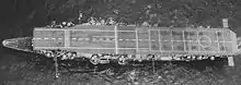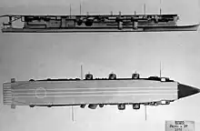 Ryūjō was a flush-decked carrier without an island superstructure; the navigating and control bridge was located just under the forward lip of the flight deck in a long glassed-in "greenhouse", whilst the superstructure was set back 23.5 meters (77 ft 1 in) from the ship's stem, giving Ryūjō a distinctive open bow. The 156.5-meter (513 ft 5 in) flight deck was 23 meters (75 ft 6 in) wide and extended well beyond the aft end of the superstructure, supported by a pair of pillars. Six transverse arrestor wires were installed on the flight deck and were modernised in 1936 to stop a 6,000 kg (13,000 lb) aircraft.[5] The ship's hangars were both 102.4 meters (335 ft 11 in) long and 18.9 meters (62 ft 0 in) wide, and had an approximate area of 3,871 square metres (41,667 sq ft).[8] Between them, they gave the ship the capacity to store 48 aircraft, but only 37 could be operated at one time.[5] After the Fourth Fleet incident, Ryūjō's bridge and the leading edge of the flight deck were rounded off to make them more streamlined. This reduced the length of the flight deck by 2 meters (6 ft 7 in).[6]