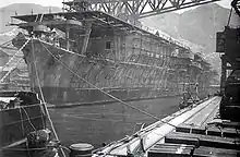 The carrier's 216.9-meter (711 ft 7 in) flight deck was 26 meters (85 ft 4 in) wide and overhung her superstructure at both ends, supported by pairs of pillars.[8] Sōryū's island was built on a starboard-side extension that protruded beyond the side of the hull so that it did not encroach on the width of the flight deck. Nine transverse arrestor wires were installed on the flight deck and could stop a 6,000 kg (13,000 lb) aircraft. The flight deck was only 12.8 meters (42 ft) above the waterline and the ship's designers kept this distance low by reducing the height of the hangars.[9] The upper hangar was 171.3 by 18.3 metres (562 by 60 ft) and had an approximate height of 4.6 meters (15 ft 1 in); the lower was 142.3 by 18.3 metres (467 by 60 ft) and had an approximate height of 4.3 meters (14 ft 1 in). Together they had an approximate total area of 5,736 square metres (61,742 sq ft).[8] This caused problems in handling aircraft because the wings of a Nakajima B5N "Kate" torpedo bomber could neither be spread nor folded in the upper hangar.[10]