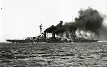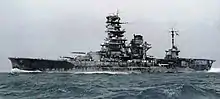 In 1931–1933 the AA guns were replaced with eight 12.7-centimetre (5 in) Type 89 dual-purpose guns, placed beside the forward superstructure in four twin-gun mounts.[11] Two twin-gun mounts for license-built Vickers two-pounder (4-centimetre (1.6 in)) light AA guns were also added while the pair of 14 cm guns on the upper deck were removed.[12]
