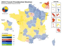 In the first round of voting in France's two round voting system, he came in third place with 22% of the vote, behind president Emmanuel Macron in first place with 28%, and narrowly behind Marine Le Pen's 23% of the vote.[42] Only the top two finishers continue on to the second round, so Mélenchon was eliminated after the results of the first round were certified. Mélenchon advised his voters not to vote for Le Pen in the second round, but did not endorse Macron. His 7.7 million first-round voters became a key demographic for the second round. He was the most popular candidate for voters aged 24–35.[43] He was the most voted candidate in the overseas departments of Martinique, Guadeloupe, French Guiana, Réunion, Saint Pierre and Miquelon and Saint Martin, obtaining majorities in several of these jurisdictions.[44] He was also the most voted candidate in Île-de-France.[45]