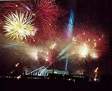 Chronologie was performed at a series of 16 performances across Europe called Europe in Concert. These were on a smaller scale than his previous concerts, featuring a miniature skyline, laser imaging and fireworks. Locations included Lausanne, Mont St Michel, London, Manchester, Barcelona, Seville and the Versailles Palace near Paris.[57] A concert was also held in Hong Kong in March 1994, to mark the opening of the city's new stadium.[58] Jarre performed many of his most well-known hits at the Concert for Tolerance on Bastille Day in 1995, celebrating the 50th anniversary of the United Nations. The Eiffel Tower was specially lit for the occasion, prompting the installation of a more permanent display.[59] The following December, he created the website "A Space for Tolerance", which featured music from En Attendant Cousteau, played while the user browsed a variety of "visual worlds".[60]