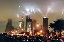 About 2,000 projectors shone images onto buildings and giant screens up to 1,200 feet (370 m) high, transforming the city's skyscrapers into spectacular backdrops for an elaborate display of fireworks and lasers. Rendez-vous Houston entered the Guinness Book of Records for its audience of over 1.5 million, beating his earlier record, set in 1979. The display was so impressive that a nearby freeway was blocked by passing vehicles, forcing the authorities to close it for the duration of the concert.[46][47] Several months later he performed to an audience of about a million at his home city of Lyon,[48] in celebration of a visit by Pope John Paul II. Watching from Lyon Cathedral, the Pope began the concert with a good-night blessing, a recording of which appears on Cities in Concert – Houston/Lyon.[4]