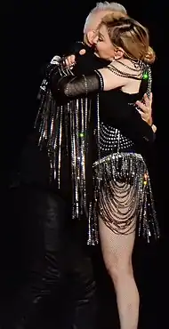 By 1985, his company made $50 million in sales worldwide.[19] In the 1985 movie Desperately Seeking Susan, Madonna wore a skirt with men's suspenders she had bought from Gaultier.[20] Besides his ready-to-wear collection, in 1988 Gaultier expanded his brand to include the label Junior Gaultier, a lower-priced line of products.[21] The Junior Gaultier outfit was selected by Jeff Banks as the Dress of the Year.[22] In 1988, he also recorded the music video How to do that.[23] At the end of the 1980s he invented a new look for the French accordionist Yvette Horner which relaunched her career.[24] In 1990, he designed Madonna's clothes for her Blond Ambition World Tour.[21][25]