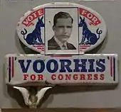 Voorhis was a candidate for the California State Assembly in 1934,[4] changing his registration from Socialist to Democrat, but was defeated by popular incumbent Herbert Evans despite receiving the backing of writer and Democratic gubernatorial candidate Upton Sinclair.[19] Two years later, he challenged incumbent John Hoeppel for the 12th district Democratic nomination. Hoeppel was weakened by a recent conviction for attempting to sell a nomination to West Point and Voorhis won the Democratic nomination, with Hoeppel finishing in third place. Running as a "Progressive Roosevelt-Democrat", Voorhis easily defeated Republican nominee Frederick F. Houser in the general election.[20]