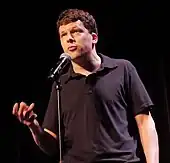 In 2015, Eisenberg portrayed Rolling Stone journalist David Lipsky in the biographical drama film The End of the Tour, appearing opposite Jason Segel, who portrayed the late author David Foster Wallace.[63] Eisenberg's third play, The Spoils, premiered off-Broadway in The New Group Perishing Square Signature Center Alice Griffin Box Theatre. The play featuring Eisenberg as Ben, also starring Kunal Nayyar, Michael Zegen, Erin Darke, and Annapurna Sriram, was the winner of The Blanche and Irving Laurie Foundation Theatre Visions Fund Award.[64] On September 8, 2015, Eisenberg released his first book, Bream Gives Me Hiccups, a collection of short humor pieces.[1][59]