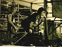 With Laguna's assistance, Jett formed the Blackhearts. Laguna recounted, "I told Joanie to forget the band and support herself on the advance money. There was enough for her but not for a band. She said she had to have a band. And I believe to this day that it was the Blackhearts, that concept, that made Joan Jett."[24] She placed an ad in the LA Weekly stating that she was "looking for three good men".[25] John Doe of X sat in on bass for the auditions held at S.I.R. studios in Los Angeles. He mentioned a local bass player, Gary Ryan, who had recently been crashing on his couch. Ryan was born Gary Moss, and adopted his stage name upon joining the Blackhearts in 1979, in part to cover for the fact that he was only 15 at the time.[26] Ryan was part of the Los Angeles punk scene and had played bass with local artists Top Jimmy and Rik L. Rik. He had been a fan of the Runaways and Jett for years. Jett recognized him at the audition and he was in. Ryan in turn recommended guitarist Eric Ambel, who was also at the time part of Rik L. Rik. The final addition to the original Blackhearts was drummer Danny "Furious" O'Brien, formerly of the San Francisco band the Avengers. This lineup played several gigs at the Golden Bear, in Huntington Beach, California, and the Whisky a Go Go in Hollywood before embarking on their first European tour, which consisted of an extensive tour of the Netherlands and a few key shows in England, including the Marquee in London.[27]