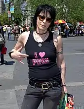 Joan Jett (born Joan Marie Larkin, September 22, 1958)[1] is an American rock singer, guitarist, songwriter, record producer and actress. She is best known for her work as the frontwoman of her band Joan Jett and the Blackhearts, and for earlier founding and performing with the Runaways, which recorded and released the hit song "Cherry Bomb". With the Blackhearts, Jett is known for her rendition of the song "I Love Rock 'n Roll" which was number-one on the Billboard Hot 100 for seven weeks in 1982.[2] Jett's other notable songs include "Bad Reputation", "Light of Day", "I Hate Myself for Loving You" and her covers of "Crimson and Clover", "Do You Wanna Touch Me (Oh Yeah)" and "Dirty Deeds".
