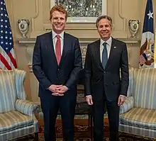 Joseph Patrick Kennedy III (born October 4, 1980) is an American politician and diplomat who currently serves as United States Special Envoy for Northern Ireland since 2022. Prior to this, Kennedy served as the U.S. representative for Massachusetts's 4th congressional district from 2013 to 2021. A member of the Democratic Party, he represented a district that extends from Boston's western suburbs to the state's South Coast. He worked as an assistant district attorney in the Cape and Islands and Middlesex County, Massachusetts, offices before his election to Congress. In January 2021, he became a CNN commentator.[1]